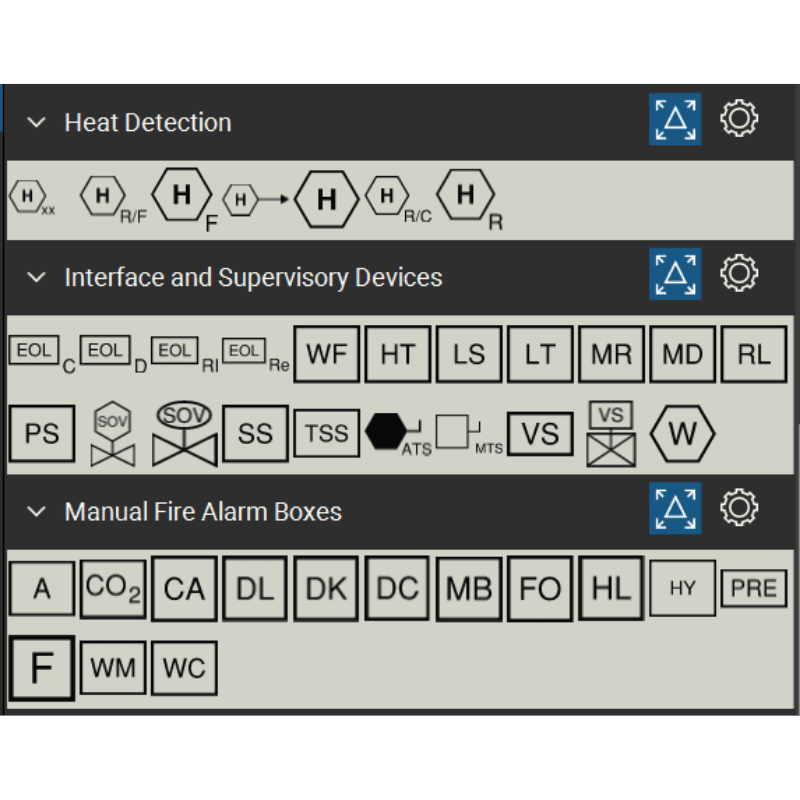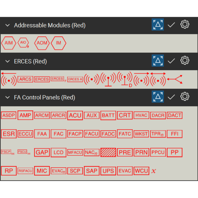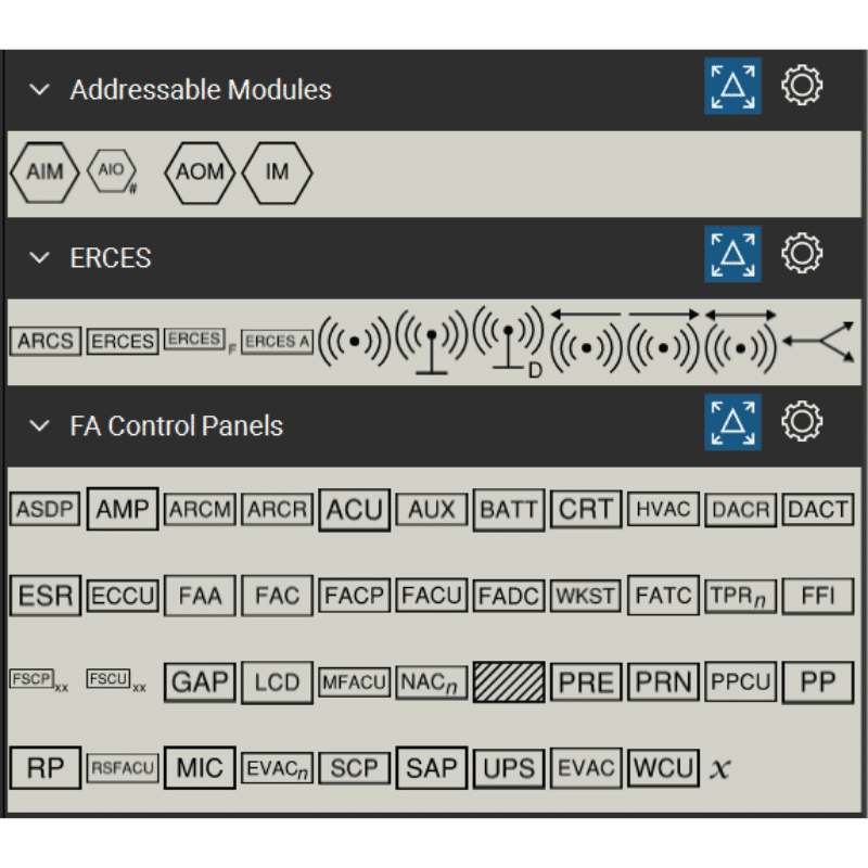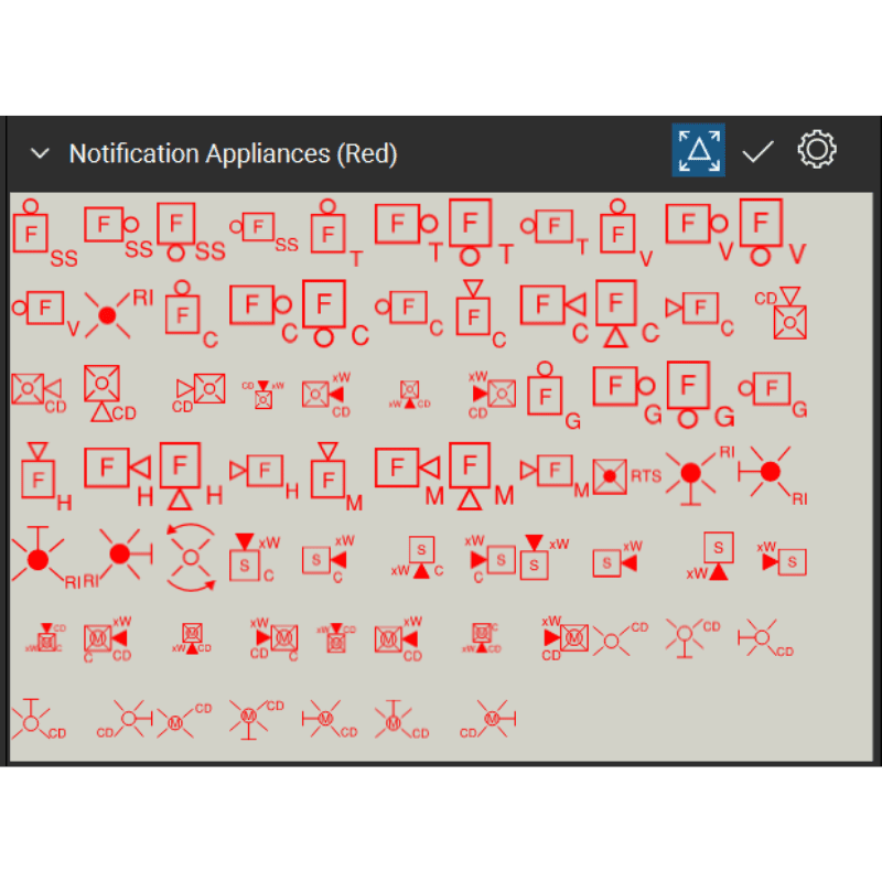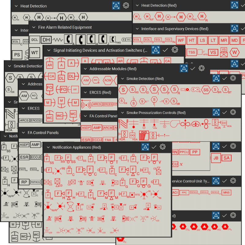 - 13 symbolic tool sets for Fire Alarm Systems